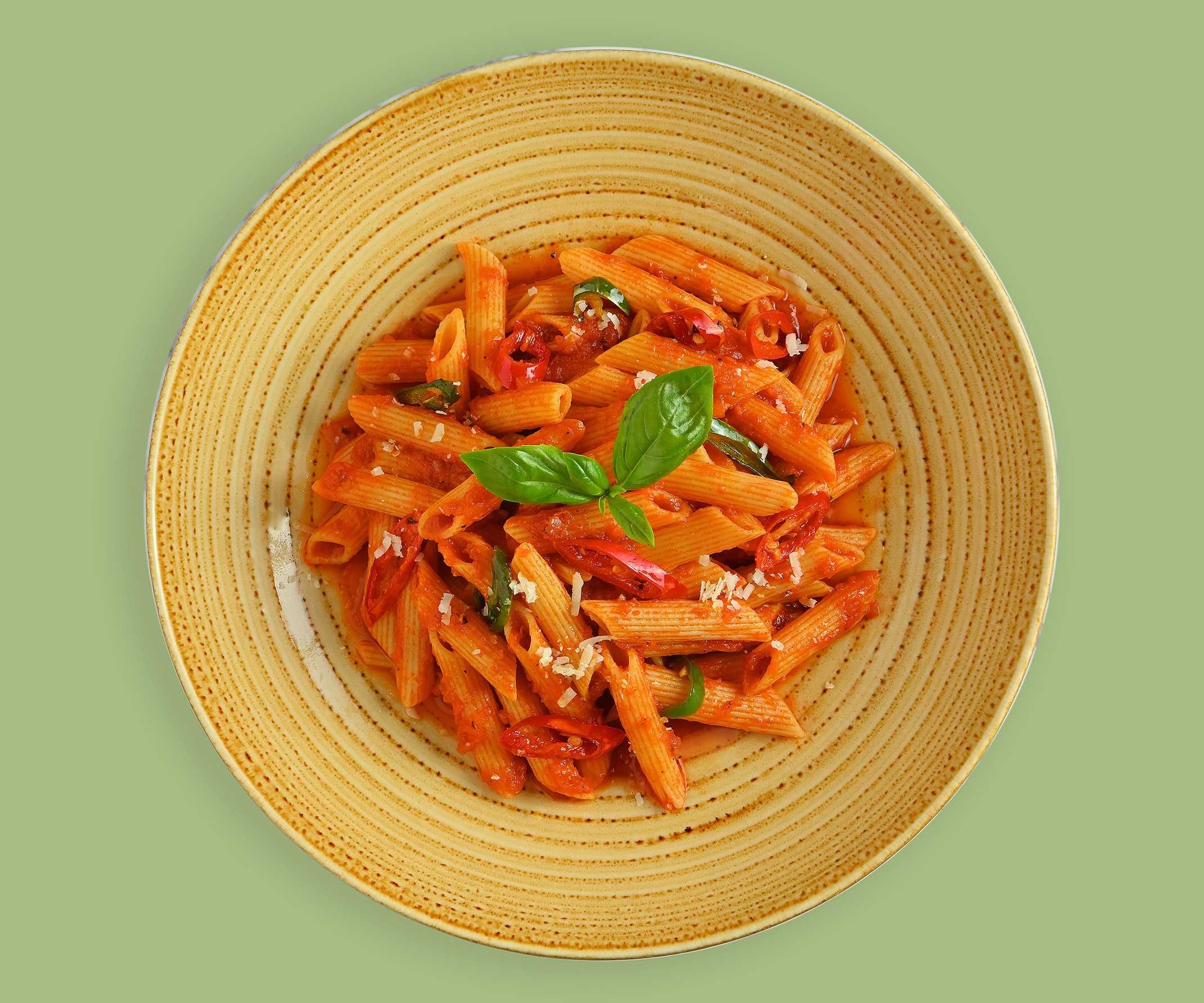 Penne pasta cooked with Arrabbiata sauce, hot chili pepper and Kalamata olives, topped with parmesan cheese
