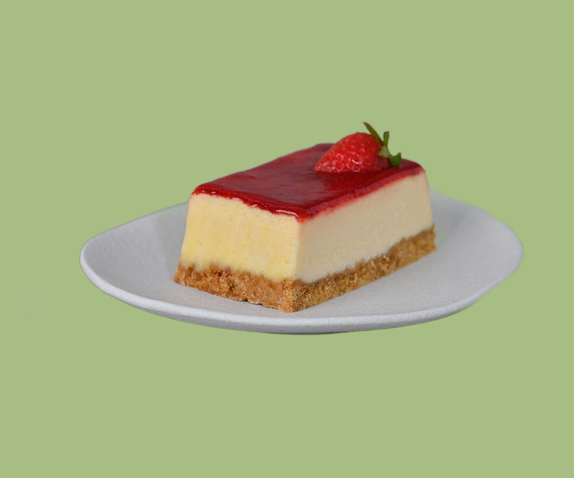 A delightful dessert featuring a creamy rich cheese filling and a buttery biscuit crust base, topped with strawberry confit.