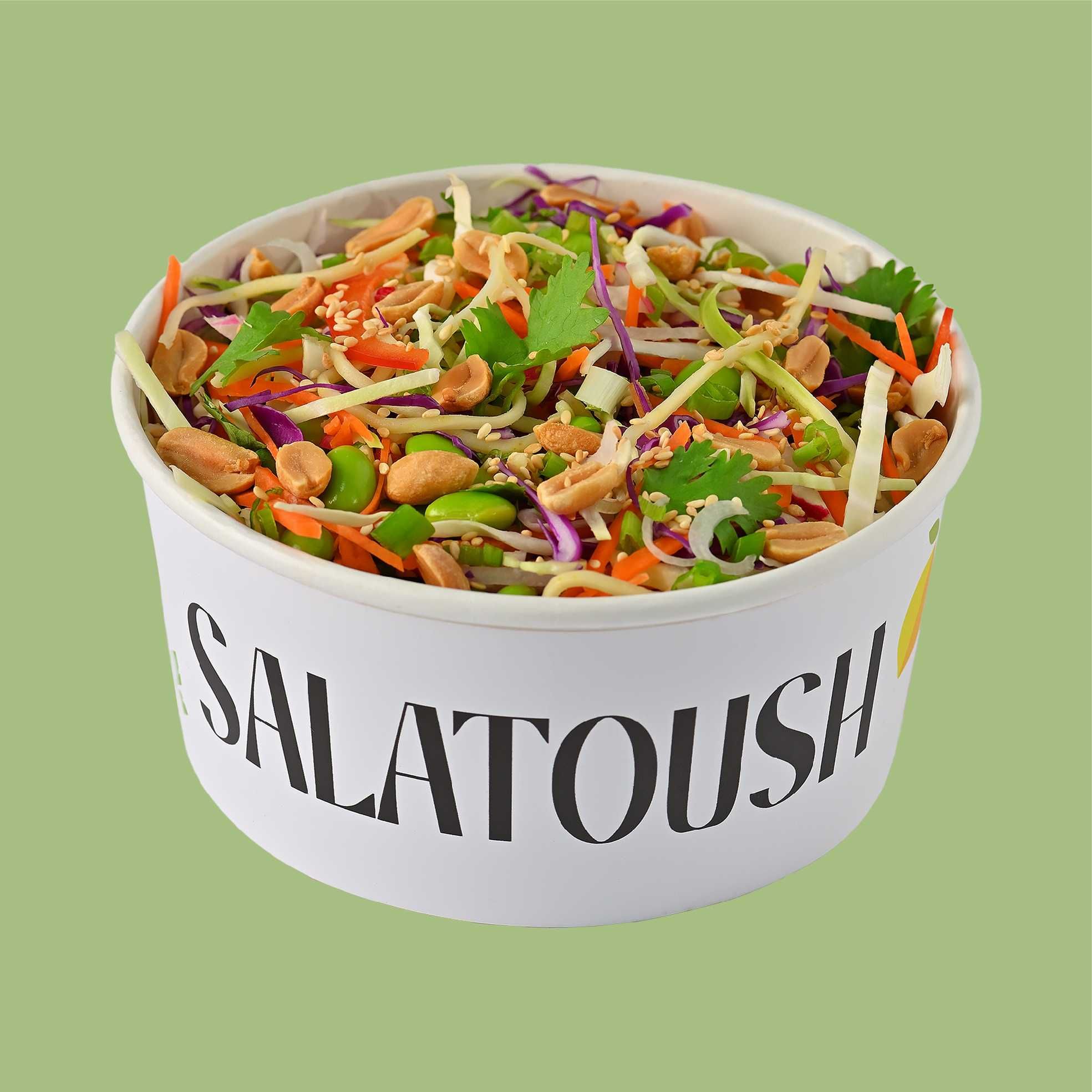 A nutty flavored salad, consisting of egg noodles, mixed cabbage, Julien carrots, radish, red capsicum, edamame, garnished with spring onions, coriander, crushed peanuts, and sesame seeds. This Salad is served cold with Thai peanuts dressing.